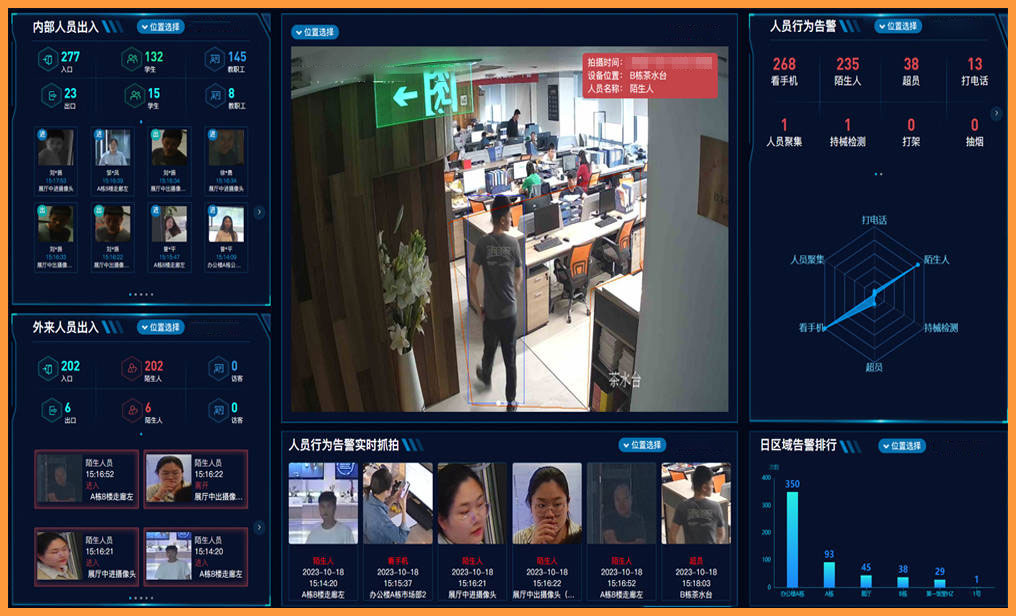 通過部署集成行為識別功能的智能攝像頭與數據分析平臺,實現對園區周界、重要出入口、公共區域的24小時智能監控。系統能夠自動識別攀爬、非法闖入、可疑滯留等行為,并實時推送告警信息至安保人員移動終端。